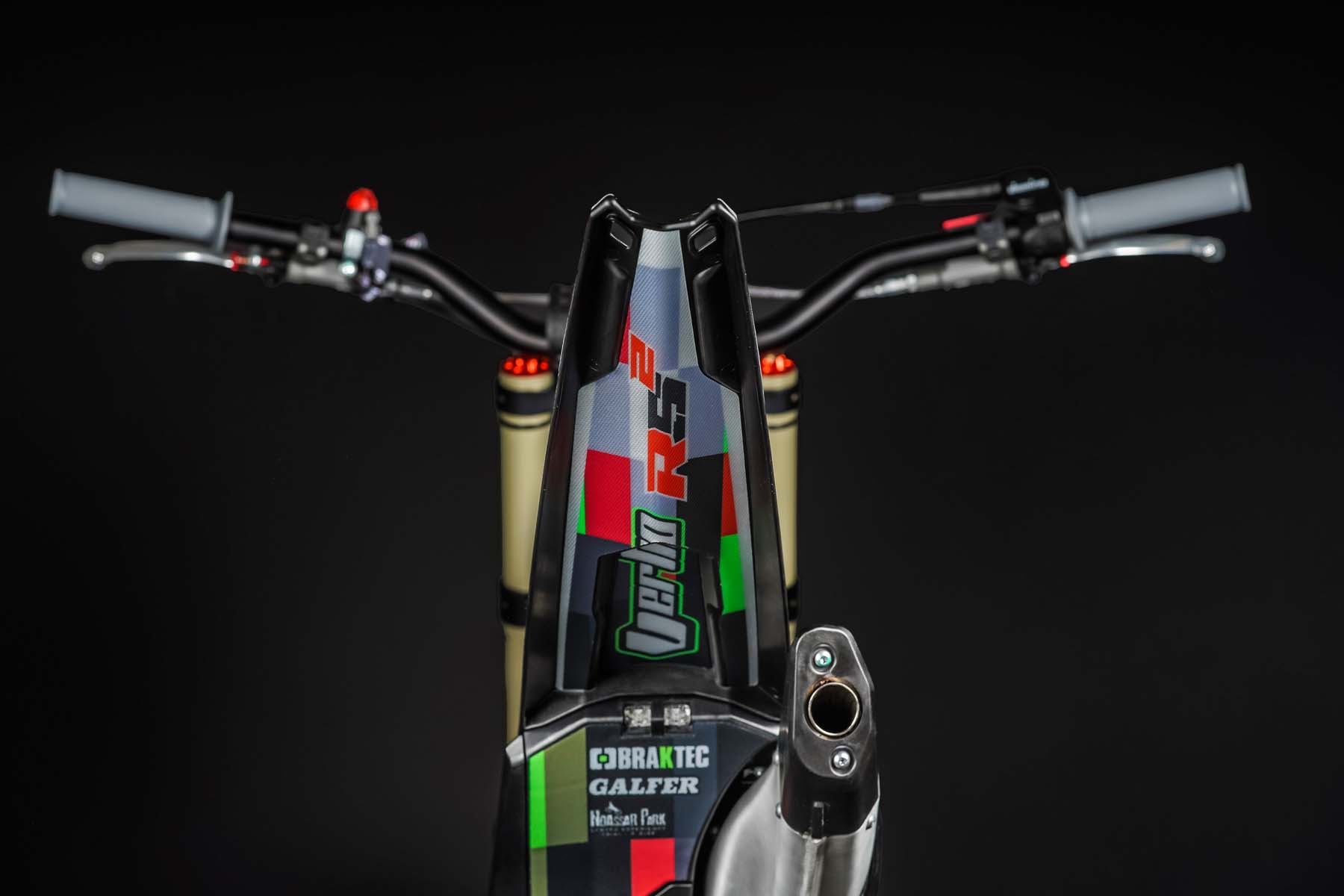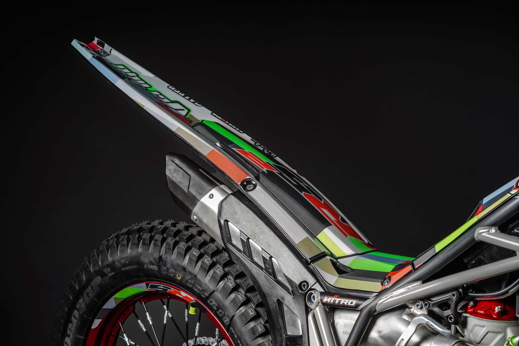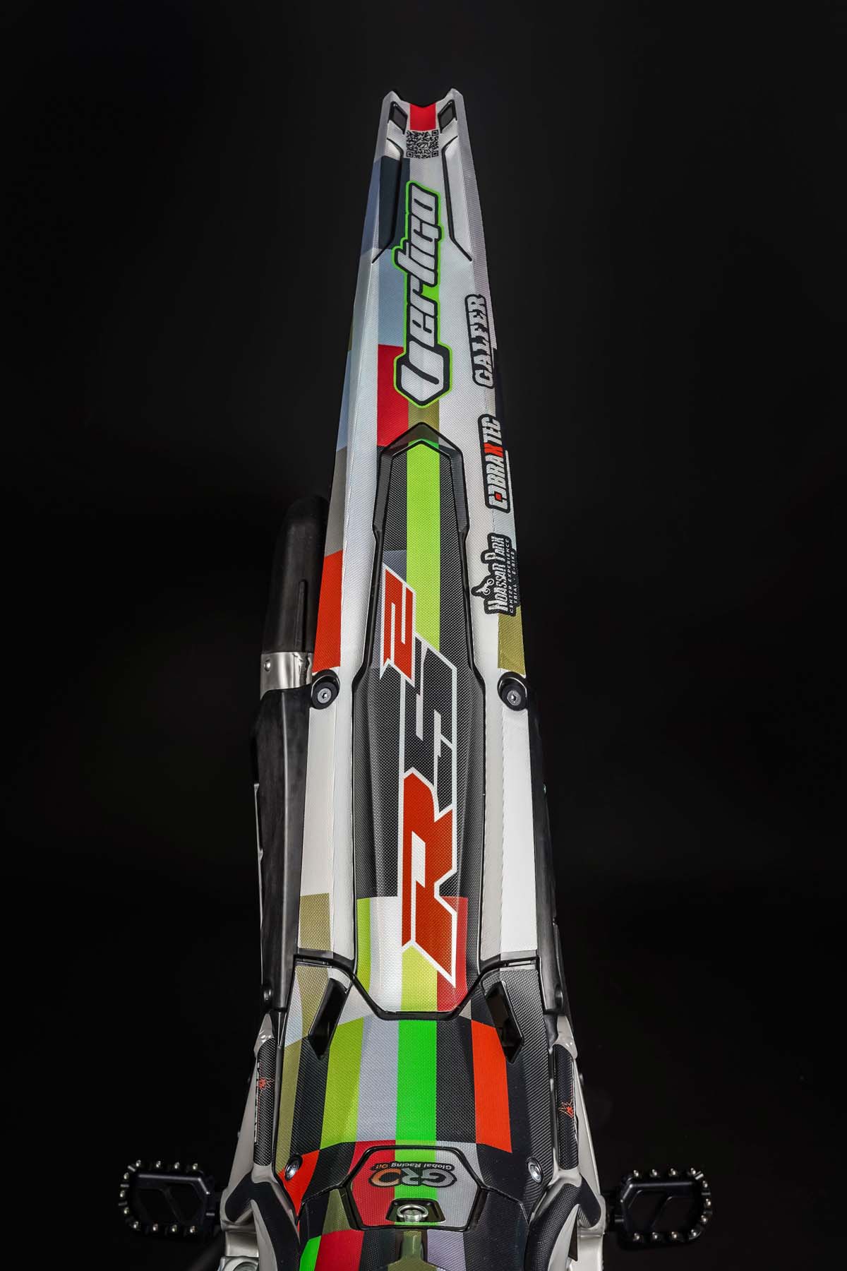 Abgerundet wird dieser neue Vertigo Nitro RS2 durch ein einzigartiges , farbenfrohes Dekor, das den RS2 ohne Zweifel leicht erkennbar macht. Hinzu kommt, dass die meisten Kunststoffe und Protektoren mit „Schlangenhaut“ überzogen sind, die vor Stößen und Kratzern schützt, die das Motorrad in Bereichen wie der Gabel, der Schwinge oder dem Hilfsrahmen erleiden kann.