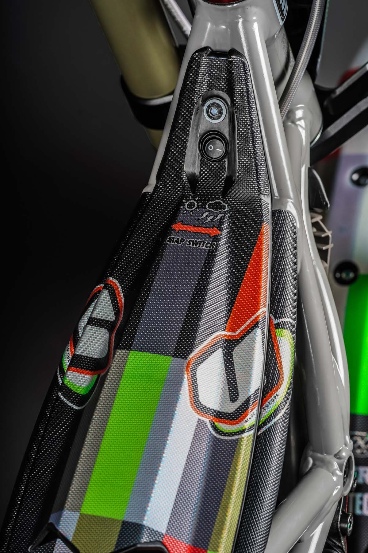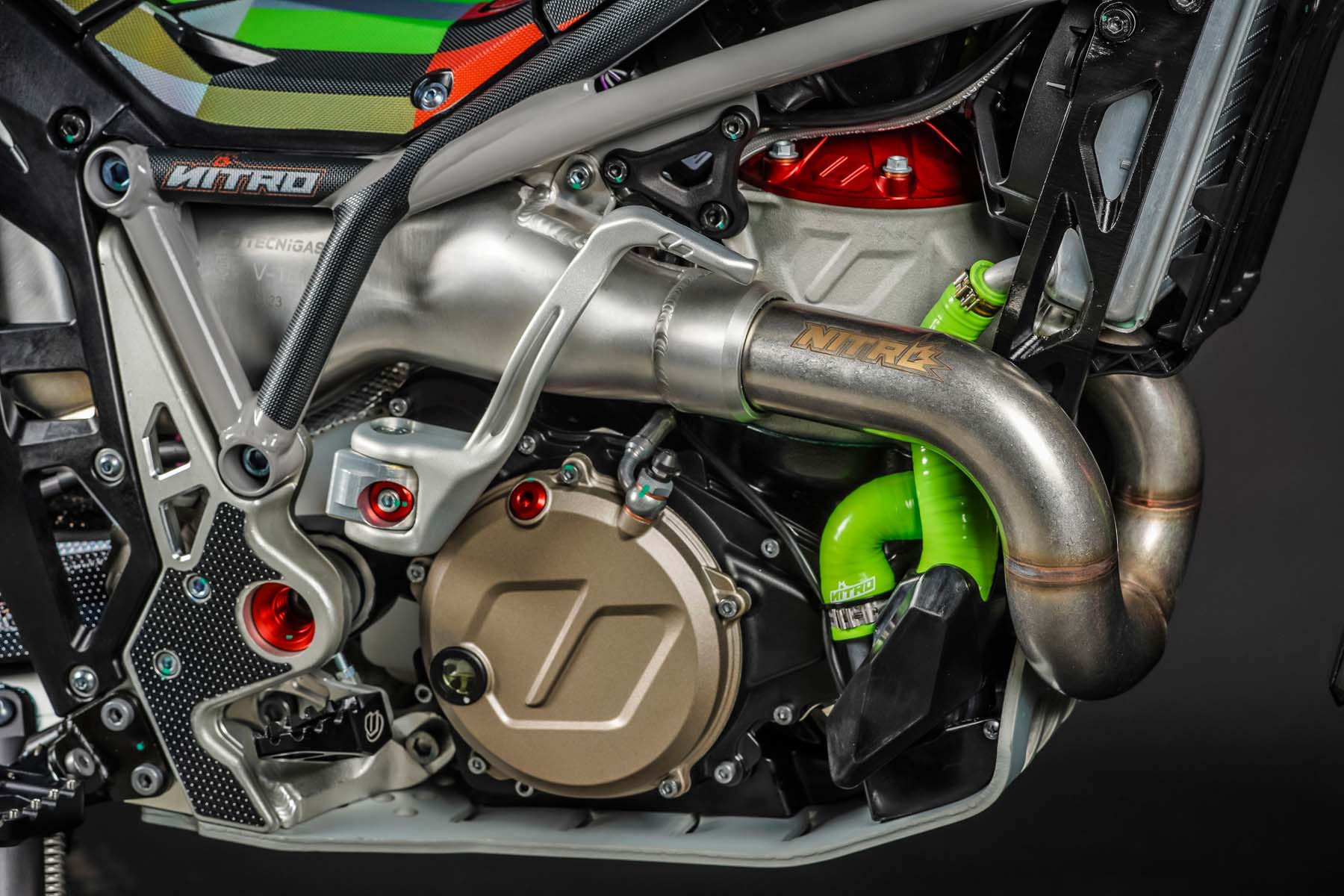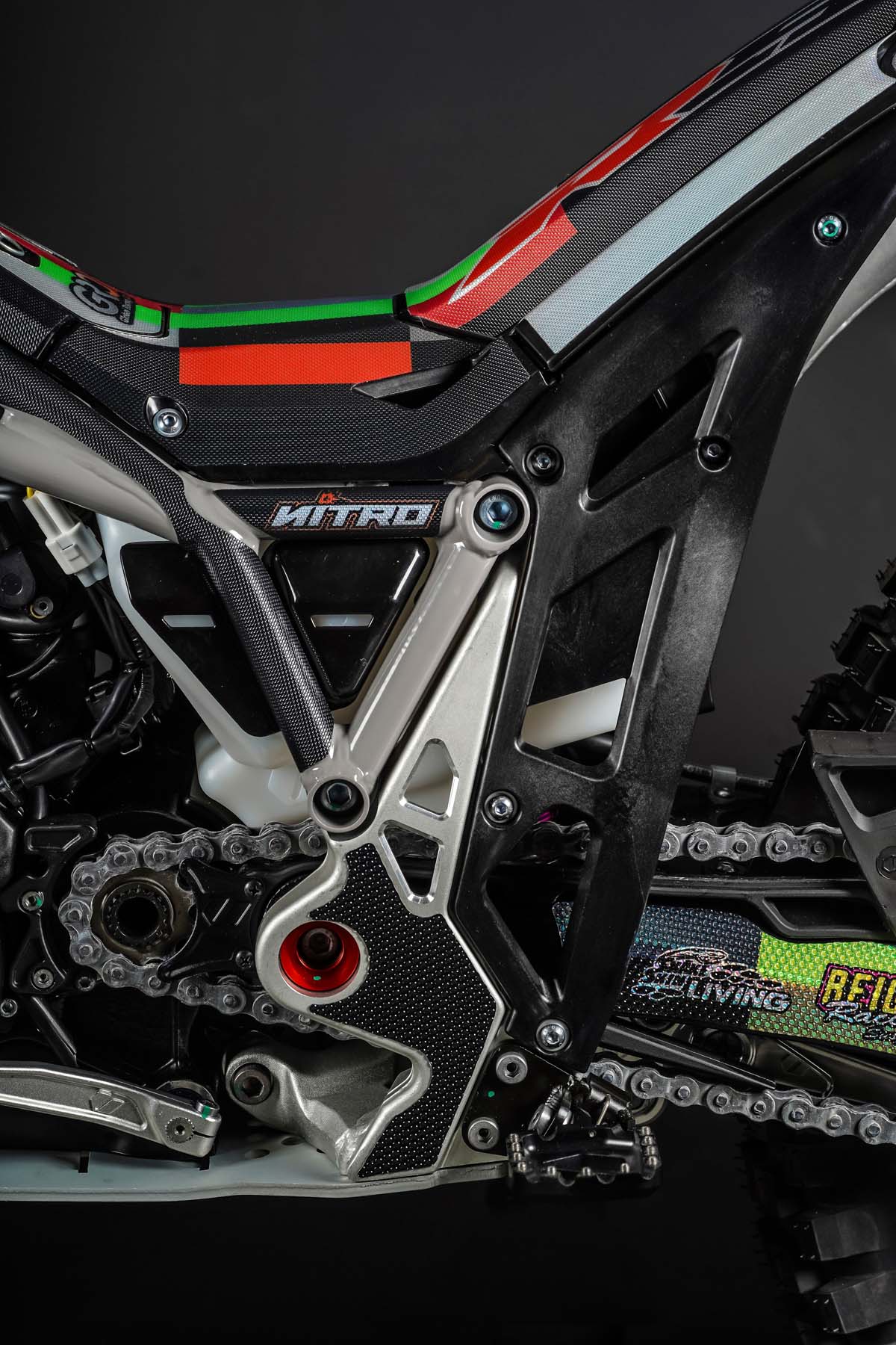 Abgerundet wird dieser neue Vertigo Nitro RS2 durch ein einzigartiges , farbenfrohes Dekor, das den RS2 ohne Zweifel leicht erkennbar macht. Hinzu kommt, dass die meisten Kunststoffe und Protektoren mit „Schlangenhaut“ überzogen sind, die vor Stößen und Kratzern schützt, die das Motorrad in Bereichen wie der Gabel, der Schwinge oder dem Hilfsrahmen erleiden kann.
