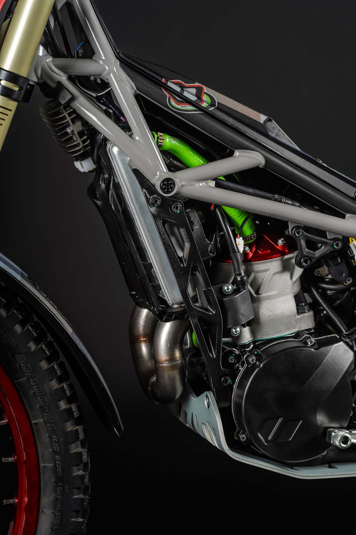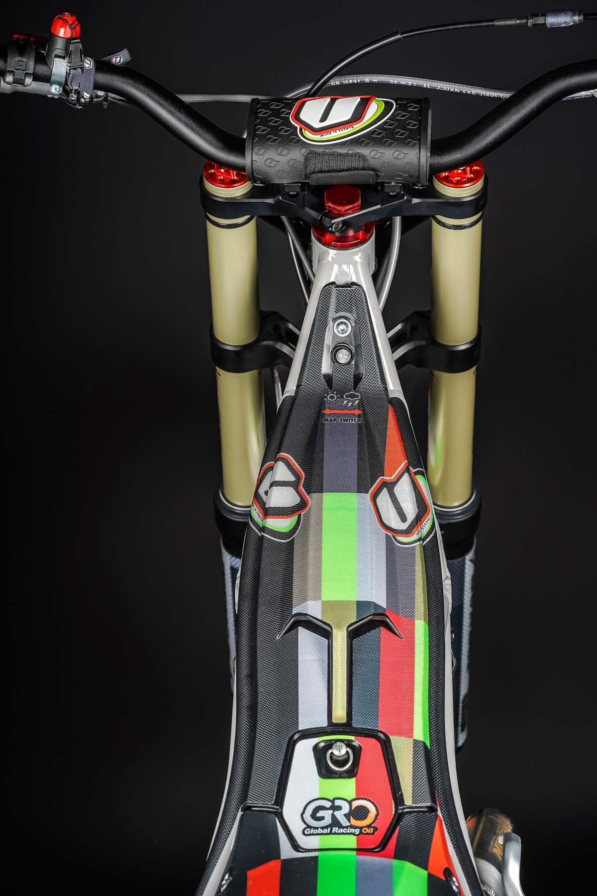 Im Rahmen werden einige neue Features vorgestellt, wie das neue Design der Chassisstrebe , die leichter ist und auch zur Kühlung beiträgt, und der neue hintere Hilfsrahmen , der bereits den neuen Vertigo Nitro integriert. Die Einstellung der Hinterradaufhängung wurde überarbeitet, um eine höhere Reaktionseffizienz zu gewährleisten. Wie üblich wird die Gabel von Tech Factory signiert geliefert.